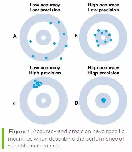 從上圖中可看出,Accuracy“準確度”是表示測量值和真實值之間有多接近,是用戶所第一重視的儀器準確性的表征;而Precision“精度”指的是測量的重復性,即每次測量是否得到相同的值,但該值是否接近真實值就不一定了。例如上圖中不難看出圖D是性能最佳,準確度和精度都是最好,圖A是最差的。但是圖B和圖C相比較,哪一臺儀器測量的更加準確呢?當然是圖B,更接近靶心;但是如果不理解precision和Accuracy的區別,僅僅根據precision的數值比較,則很有可能得出的結論是圖C,因為圖C的點看似更為“密集”,precision好,但是得到的結果和真實值卻相去甚遠,換句話說,該儀器測量的值重復性好,但是測出的數據是錯的!??!