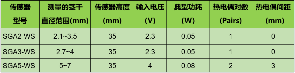 可測量直徑范圍在2.1~7mm之間的莖干,適用于莖干粗細(xì)比較均勻的植物,測量時需要將整個傳感器包裹在植物莖干上。型號如下: