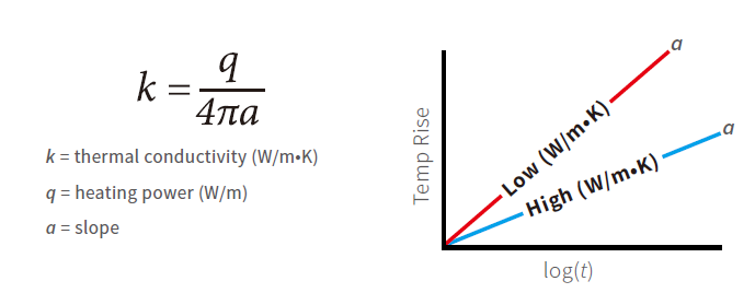 探針傳感器由一根較細(xì)的加熱線和溫度傳感器組成,溫度傳感器密封在長度為100mm的不銹鋼管中(50mm探針可選)。測量時,傳感器被完全插入待測的樣品中,采用恒流源(Q)將熱量傳遞到樣品,并在一定時間內(nèi)記錄溫度的上升。利用溫度與時間對數(shù)的斜率(A) ,計算導(dǎo)熱系數(shù)(K)。熱導(dǎo)率越高,斜率越低。對于導(dǎo)熱系數(shù)較低的材料,則斜率較高。